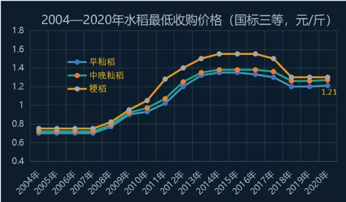 2020年國家繼續(xù)在稻谷主產(chǎn)區(qū)實行最低收購價政策。今年國標(biāo)三等早秈稻最低收購價為1.21元/斤,較上年上漲一分錢。