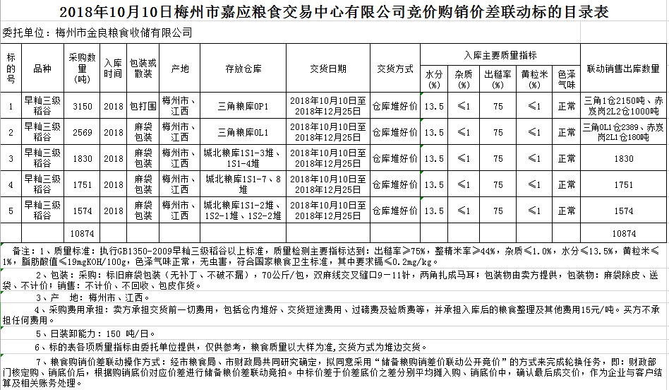 受客戶委托,梅州市嘉應(yīng)糧食交易中心有限公司定于2018年10月10日(星期三)舉辦稻谷購銷價差聯(lián)動標(biāo)的交易會,梅州市金良糧食收儲有限公司擬銷售和采購早秈稻10874噸。