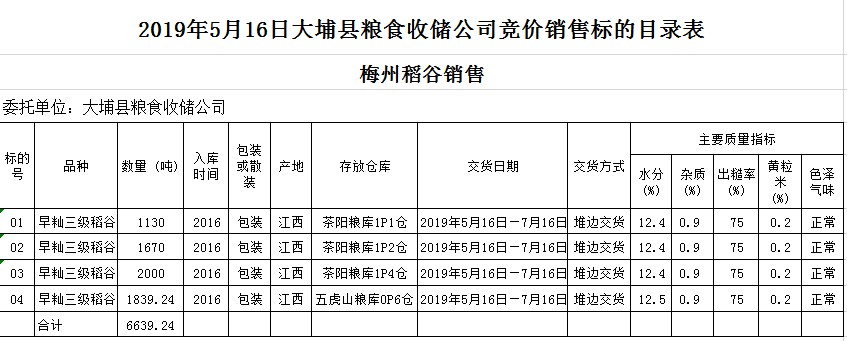 受客戶委托,梅州市嘉應糧食交易中心有限公司定于2019年5月16日(星期四)舉辦糧食競價交易會,大埔縣糧食收儲公司擬銷售2016年早秈稻6639.24噸。