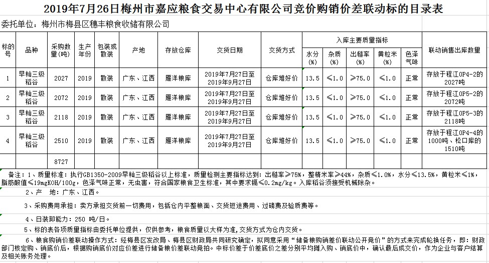 交易時間和地點:2019年7月26日(星期五)上午10時15分。廣東省梅州市彬芳大道南161號梅州市糧食交易中心3樓。