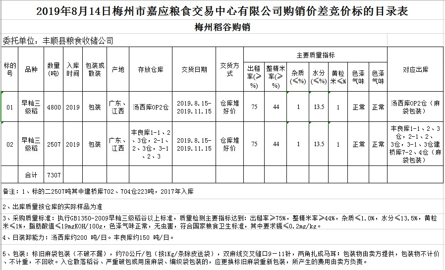 受客戶委托,梅州市嘉應(yīng)糧食交易中心有限公司定于2019年8月14日(星期三)舉辦稻谷購銷價差聯(lián)動標(biāo)的交易會,豐順縣糧食收儲公司擬銷售和采購早秈稻7307噸。