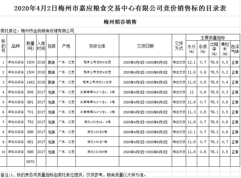受客戶委托,梅州市嘉應(yīng)糧食交易中心有限公司定于2020年4月2日(星期四)舉辦糧食競價(jià)交易會(huì),梅州市金良糧食收儲(chǔ)有限公司擬銷售2017年、2018年早秈稻9570噸。