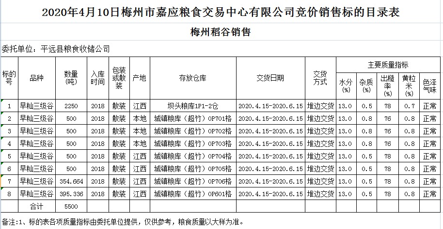 受客戶委托,梅州市嘉應(yīng)糧食交易中心有限公司定于2020年4月10日(星期五)舉辦糧食競(jìng)價(jià)交易會(huì),平遠(yuǎn)縣糧食收儲(chǔ)公司擬銷售2018年早秈稻5500噸。