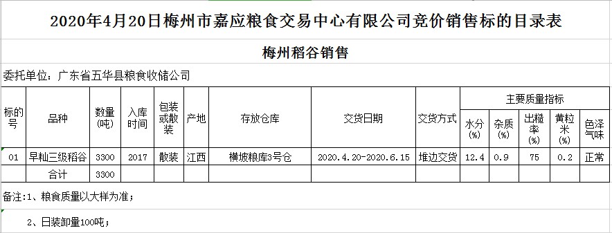 受客戶委托,梅州市嘉應(yīng)糧食交易中心有限公司定于2020年4月20日(星期一)舉辦糧食競(jìng)價(jià)交易會(huì),廣東省五華縣糧食收儲(chǔ)公司擬銷(xiāo)售2017年早秈稻3300噸。