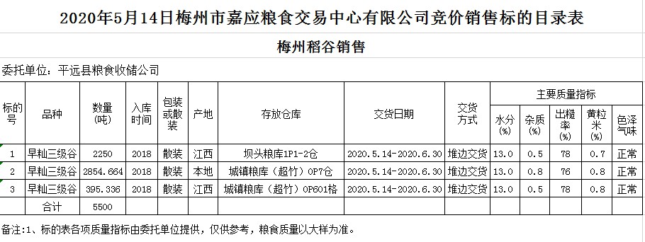 受客戶委托,梅州市嘉應(yīng)糧食交易中心有限公司定于2020年5月14日(星期四)舉辦糧食競價交易會,平遠縣糧食收儲公司擬銷售2018年早秈稻5500噸。