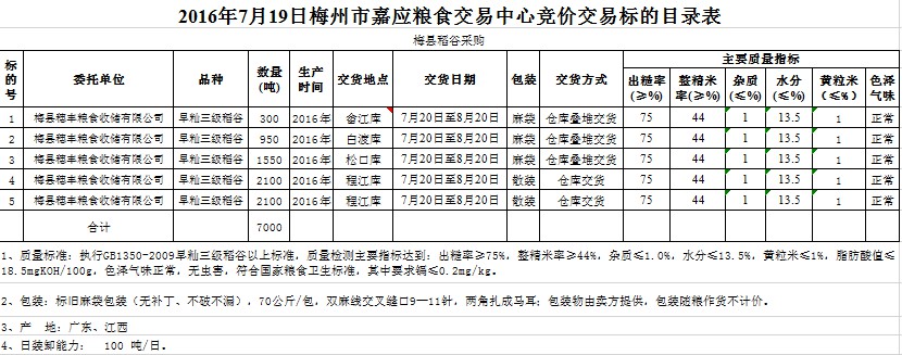 受客戶委托,梅州市嘉應(yīng)糧食交易中心有限公司定于2016年7月19日舉辦糧食競價交易會,梅州市梅縣區(qū)穗豐糧食收儲有限公司擬采購2016年產(chǎn)早秈三級稻谷7000噸。
