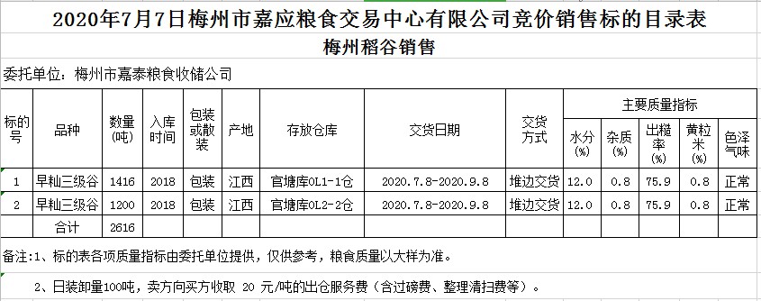 受客戶委托,梅州市嘉應糧食交易中心有限公司定于2020年7月7日(星期二)舉辦糧食競價交易會,梅州市嘉泰糧食收儲公司擬銷售2018年早秈稻2616噸。