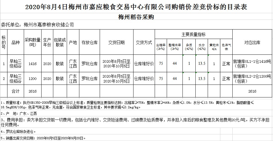 受客戶委托,梅州市嘉應(yīng)糧食交易中心有限公司定于2020年8月4日(星期二)舉辦稻谷購銷價差聯(lián)動標(biāo)的交易會,梅州市嘉泰糧食收儲公司擬銷售和采購早秈稻2616噸。
