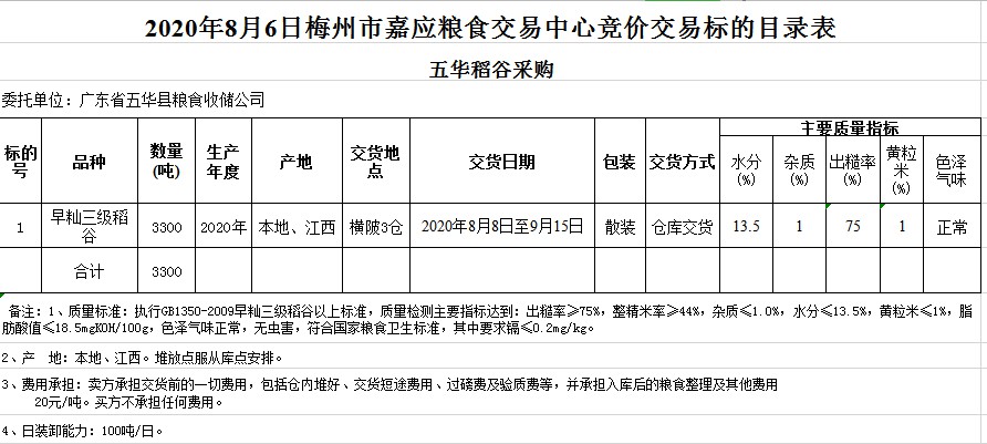 交易時間和地點:2020年8月6日(星期四)上午10時。廣東省梅州市彬芳大道南161號梅州市糧食交易中心3樓。