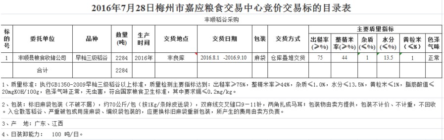 受客戶委托,梅州市嘉應(yīng)糧食交易中心有限公司定于2016年7月28日舉辦糧食競(jìng)價(jià)交易會(huì),豐順縣糧食收儲(chǔ)公司擬采購(gòu)2016年產(chǎn)早秈三級(jí)稻谷2284噸。