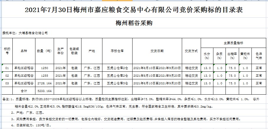 受客戶委托,梅州市嘉應(yīng)糧食交易中心有限公司定于2021年7月30日(星期五)舉辦糧食競價交易會。大埔縣糧食收儲公司擬采購2021年早秈稻5233.164噸。