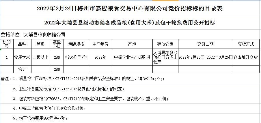 2022年大埔縣縣級(jí)動(dòng)態(tài)儲(chǔ)備成品糧(食用大米)及包干輪換費(fèi)用公開招標(biāo)公告