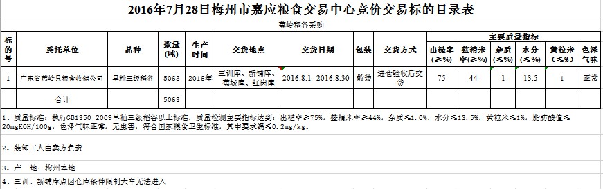 受客戶委托,梅州市嘉應糧食交易中心有限公司定于2016年7月28日舉辦糧食競價交易會,廣東省蕉嶺縣糧食收儲公司擬采購2016年產(chǎn)早秈三級稻谷5063噸。