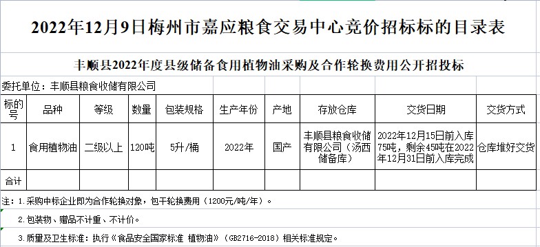 受客戶委托,梅州市嘉應糧食交易中心有限公司定于2022年12月9日(星期五)上午10時5分在廣東省梅州市彬芳大道南161號梅州市糧食交易中心3樓,舉辦豐順縣縣級食用植物油儲備采購及合作輪換費公開招標。