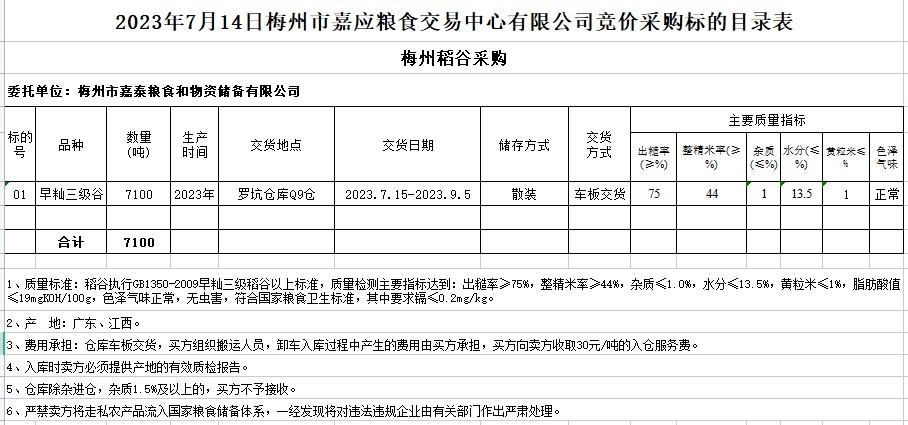 受客戶委托,梅州市嘉應(yīng)糧食交易中心有限公司定于2023年7月14日(星期五)舉辦糧食競(jìng)價(jià)交易會(huì)。梅州市嘉泰糧食和物資儲(chǔ)備有限公司擬采購(gòu)2023年早秈稻7100噸。