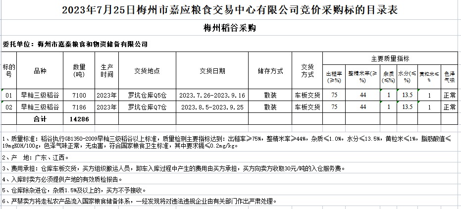 受客戶(hù)委托,梅州市嘉應(yīng)糧食交易中心有限公司定于2023年7月25日(星期二)舉辦糧食競(jìng)價(jià)交易會(huì)。梅州市嘉泰糧食和物資儲(chǔ)備有限公司擬采購(gòu)2023年早秈稻14286噸。