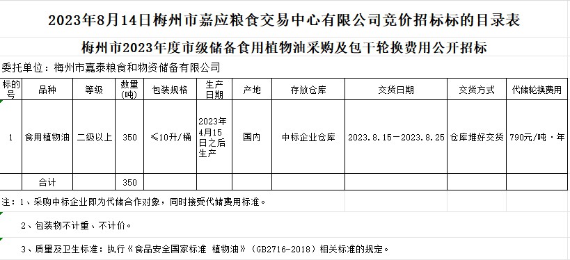 受梅州市嘉泰糧食和物資儲備有限公司委托,梅州市嘉應糧食交易中心有限公司定于2023年8月14日(星期一)上午10時15分舉辦梅州市市級儲備食用植物油采購及包干輪換費用公開招標。