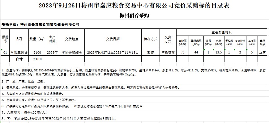 受客戶委托,梅州市嘉應(yīng)糧食交易中心有限公司定于2023年9月26日(星期二)舉辦糧食競價(jià)交易會(huì)。梅州市嘉泰糧食和物資儲(chǔ)備有限公司擬采購2023年早秈稻谷7100噸。