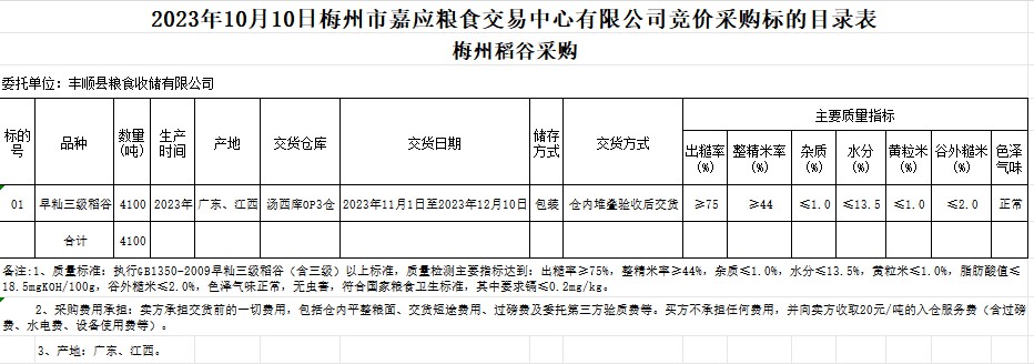 受客戶委托,梅州市嘉應(yīng)糧食交易中心有限公司定于2023年10月10日(星期二)舉辦糧食競價交易會。豐順縣糧食收儲有限公司擬采購2023年早秈稻谷4100噸。
