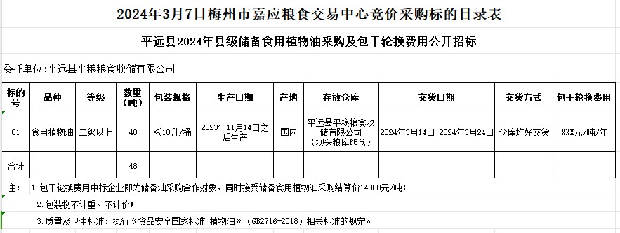 受平遠(yuǎn)縣平糧糧食收儲有限公司委托,梅州市嘉應(yīng)糧食交易中心有限公司定于2024年3月7日(星期四)上午10時(shí)舉辦平遠(yuǎn)縣2024年縣級儲備食用植物油采購及包干輪換費(fèi)用公開招標(biāo)。