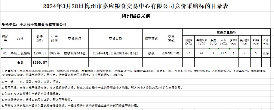 受客戶委托,梅州市嘉應(yīng)糧食交易中心有限公司定于2024年3月28日(星期四)舉辦糧食競價交易會。平遠縣平糧糧食收儲有限公司擬采購2023年產(chǎn)早秈稻1290.57噸。