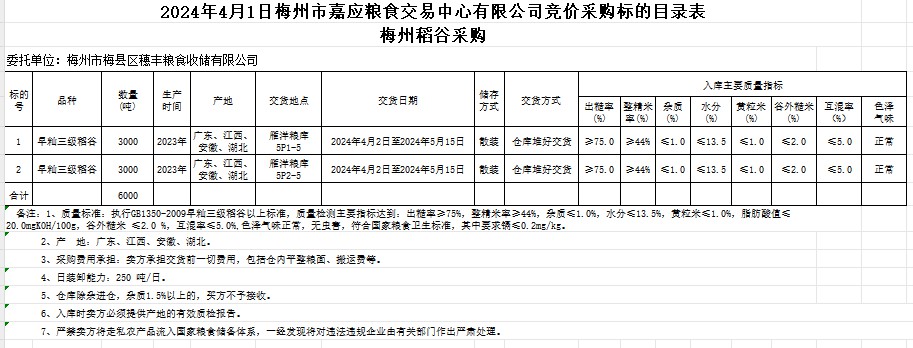 受客戶(hù)委托,梅州市嘉應(yīng)糧食交易中心有限公司定于2024年4月1日(星期一)舉辦糧食競(jìng)價(jià)交易會(huì)。梅州市梅縣區(qū)穗豐糧食收儲(chǔ)有限公司擬采購(gòu)2023年產(chǎn)早秈稻6000噸。