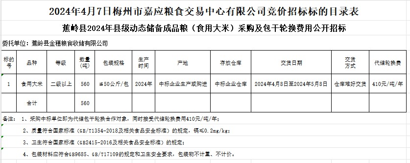 蕉嶺縣2024年縣級動態(tài)儲備成品糧(食用大米)采購及包干輪換費(fèi)用公開招標(biāo)公告