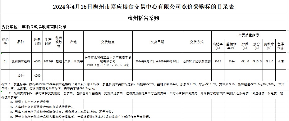 受客戶委托,梅州市嘉應(yīng)糧食交易中心有限公司定于2024年4月15日(星期一)舉辦糧食競價交易會。豐順縣糧食收儲有限公司擬采購2023年產(chǎn)晚秈稻4000噸。