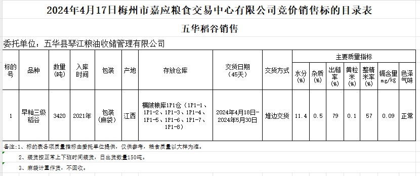 受客戶(hù)委托,梅州市嘉應(yīng)糧食交易中心有限公司定于2024年4月17日(星期三)舉辦糧食競(jìng)價(jià)交易會(huì)。五華縣琴江糧油收儲(chǔ)管理有限公司擬銷(xiāo)售2021年產(chǎn)早秈稻3420噸。