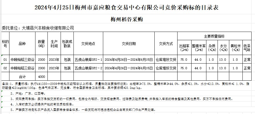 2024年4月25日大埔縣興豐糧食收儲有限公司稻谷采購