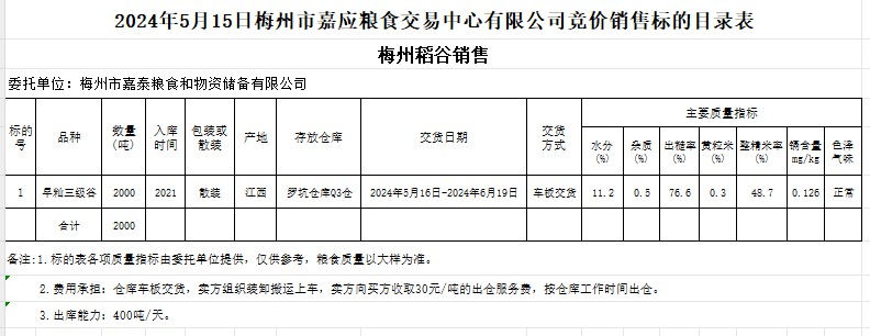 受客戶委托,梅州市嘉應(yīng)糧食交易中心有限公司定于2024年5月15日(星期三)舉辦糧食競(jìng)價(jià)交易會(huì)。梅州市嘉泰糧食和物資儲(chǔ)備有限公司擬銷售2021年產(chǎn)早秈稻2000噸。