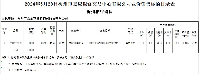 受客戶委托,梅州市嘉應糧食交易中心有限公司定于2024年5月28日(星期二)舉辦糧食競價交易會。梅州市嘉泰糧食和物資儲備有限公司擬銷售2021年產(chǎn)早秈稻2000噸。