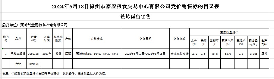 受客戶委托,梅州市嘉應(yīng)糧食交易中心有限公司定于2024年6月18日(星期二)舉辦糧食競價交易會。蕉嶺縣金穗糧食收儲有限公司擬銷售2021年產(chǎn)早秈稻3060.28噸。