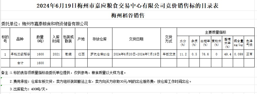 受客戶(hù)委托,梅州市嘉應(yīng)糧食交易中心有限公司定于2024年6月19日(星期三)舉辦糧食競(jìng)價(jià)交易會(huì)。梅州市嘉泰糧食和物資儲(chǔ)備有限公司擬銷(xiāo)售2021年產(chǎn)早秈稻1600噸。