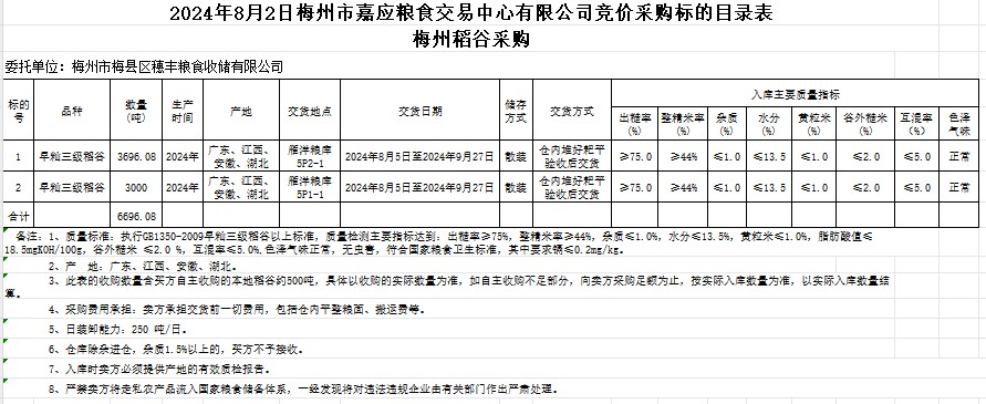 受客戶委托,梅州市嘉應(yīng)糧食交易中心有限公司定于2024年8月2日(星期五)舉辦糧食競價(jià)交易會(huì)。梅州市梅縣區(qū)穗豐糧食收儲有限公司擬采購2024年產(chǎn)早秈稻6696.08噸。