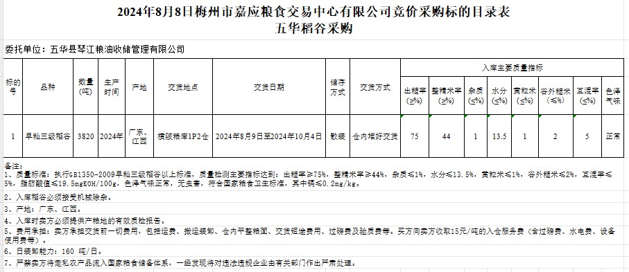 受客戶(hù)委托,梅州市嘉應(yīng)糧食交易中心有限公司定于2024年8月8日(星期四)舉辦糧食競(jìng)價(jià)交易會(huì)。五華縣琴江糧油收儲(chǔ)管理有限公司擬采購(gòu)2024年產(chǎn)早秈稻谷3820噸。