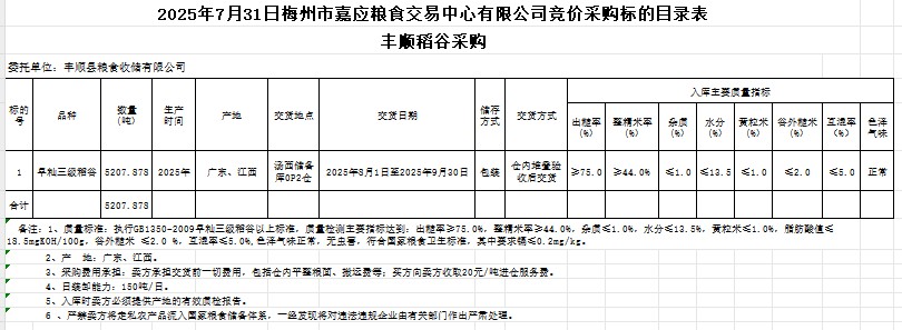 受客戶委托,梅州市嘉應(yīng)糧食交易中心有限公司定于2025年7月31日(星期四)舉辦糧食競(jìng)價(jià)交易會(huì)。豐順縣糧食收儲(chǔ)有限公司擬采購(gòu)2025年產(chǎn)早秈稻谷5207.878噸。