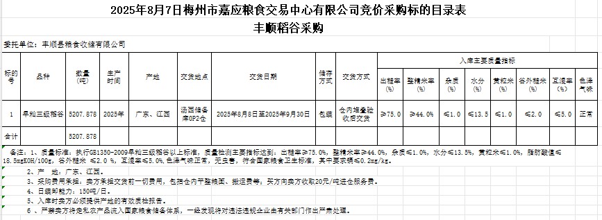受客戶委托,梅州市嘉應糧食交易中心有限公司定于2025年8月7日(星期四)舉辦糧食競價交易會。豐順縣糧食收儲有限公司擬采購2025年產早秈稻谷5207.878噸。