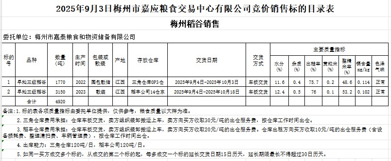受客戶委托,梅州市嘉應糧食交易中心有限公司定于2025年9月3日(星期三)舉辦糧食競價交易會。梅州市嘉泰糧食和物資儲備有限公司擬銷售2022年、2023年產早秈稻谷4920噸。