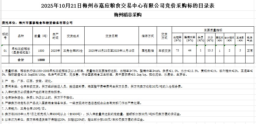 受客戶委托,梅州市嘉應(yīng)糧食交易中心有限公司定于2025年10月21日(星期二)舉辦糧食競價交易會。梅州市嘉泰糧食和物資儲備有限公司擬采購2025年產(chǎn)早秈稻谷1800噸。