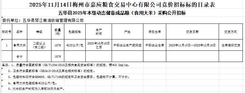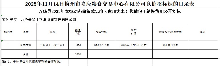 五華縣2025年本級動態(tài)儲備成品糧(食用大米)采購及代儲包干輪換費(fèi)用公開招標(biāo)公告