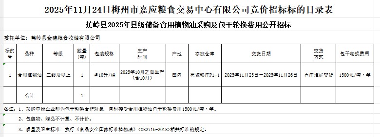 受蕉嶺縣金穗糧食收儲(chǔ)有限公司委托,梅州市嘉應(yīng)糧食交易中心有限公司定于2025年11月24日(星期一)上午10:00在廣東省梅州市彬芳大道南161號(hào)梅州市糧食交易中心3樓,舉辦蕉嶺縣2025年縣級(jí)儲(chǔ)備食用植物油采購及包干輪換費(fèi)用公開招標(biāo)。