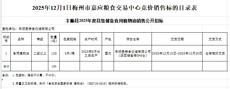 受客戶委托,梅州市嘉應(yīng)糧食交易中心有限公司定于2025年12月1日(星期一)舉辦糧食競價(jià)交易會(huì)。豐順縣糧食收儲(chǔ)有限公司擬銷售2025年食用植物油120噸。
