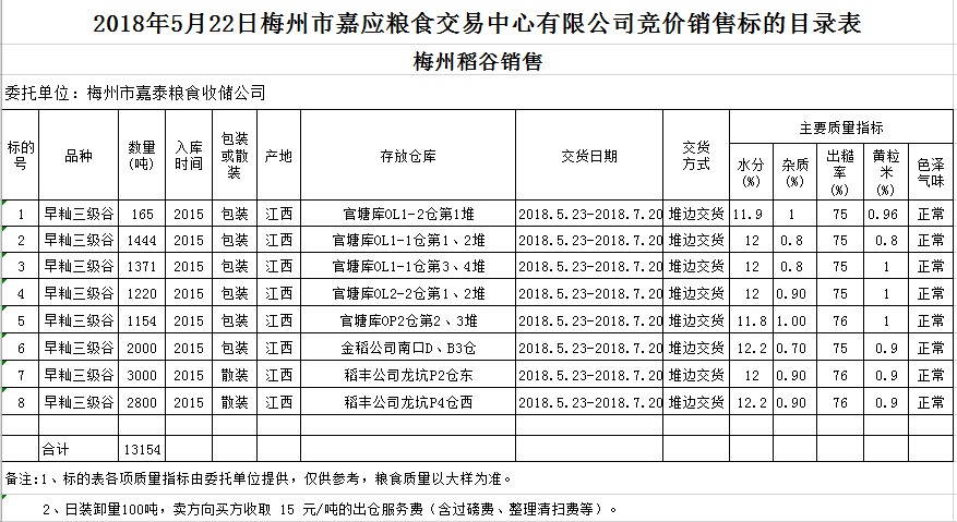 受客戶委托,梅州市嘉應(yīng)糧食交易中心有限公司定于2018年5月22日(星期二)舉辦糧食競(jìng)價(jià)交易會(huì),梅州市嘉泰糧食收儲(chǔ)公司擬銷售早秈稻13154噸。