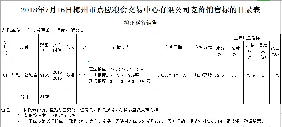 受客戶(hù)委托,廣東省蕉嶺縣糧食收儲(chǔ)公司定于2018年7月16日(星期一)舉辦糧食競(jìng)價(jià)交易會(huì),擬銷(xiāo)售早秈稻3455噸。