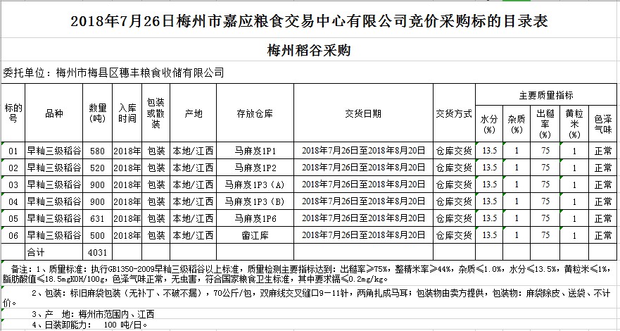 交易時間和地點:2018年7月26日(星期四)上午10時。廣東省梅州市彬芳大道南161號梅州市糧食交易中心3樓。